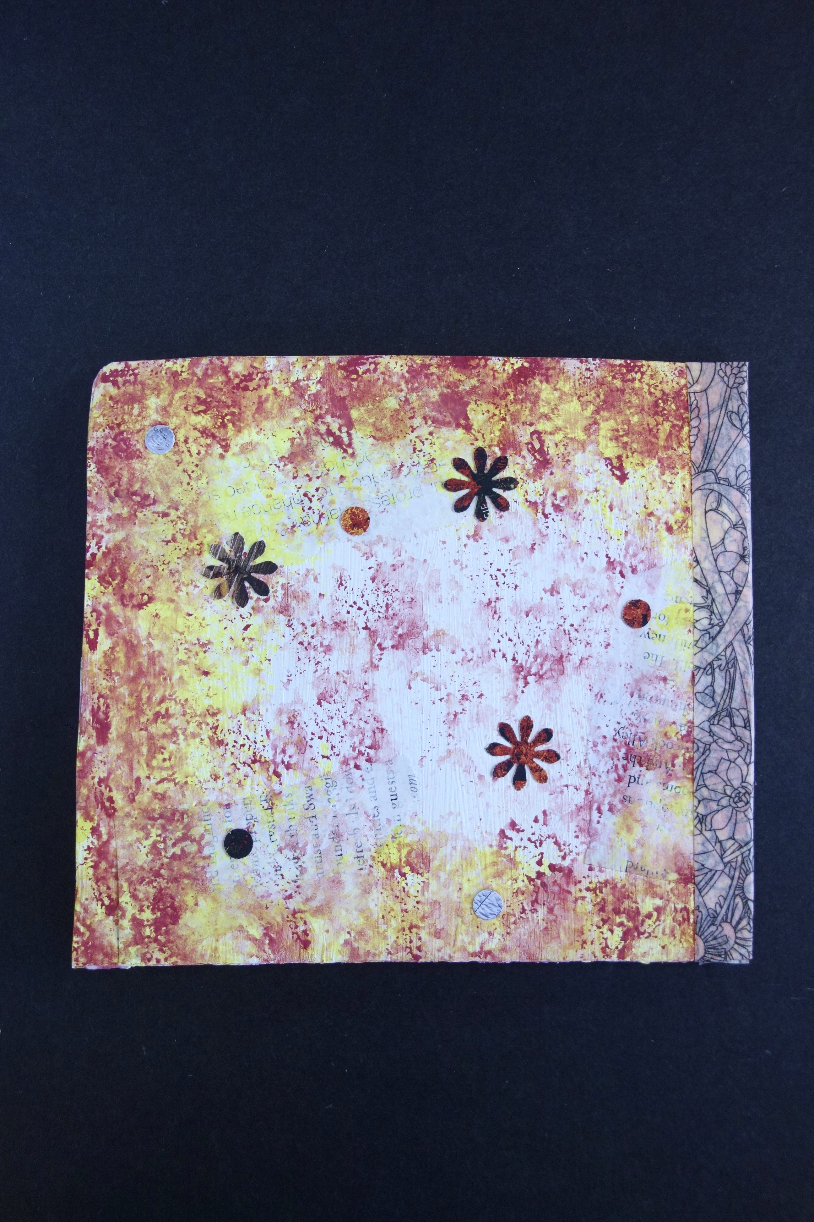 This was originally an envelope from a credit card mailer. I painted it white to cover any words and illustrations. Then I added sponge painting and collage to give it a layered look. This is the back of the envelope.